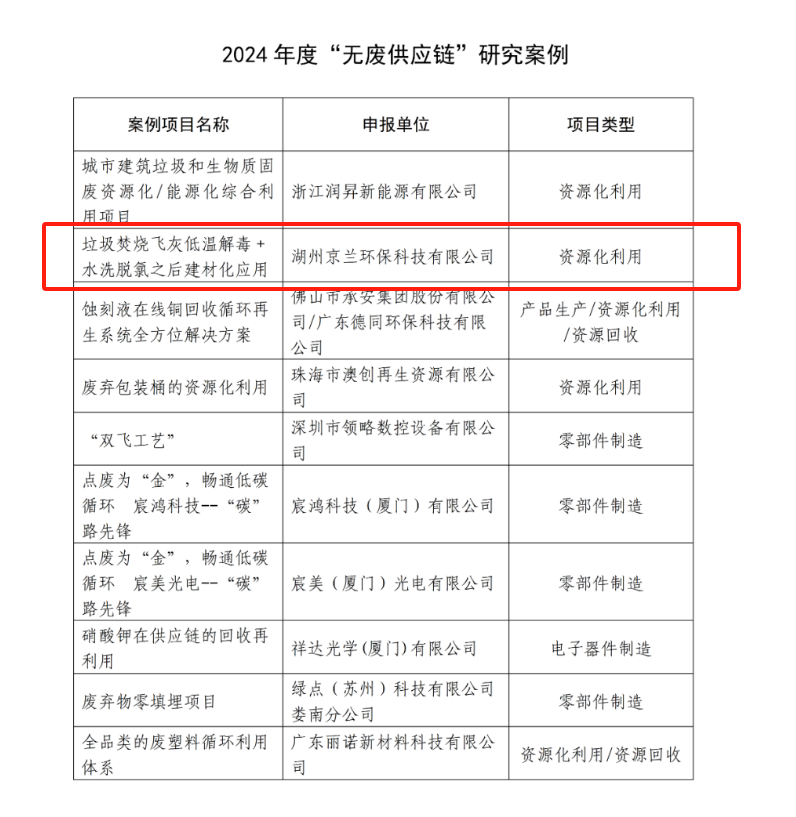 根據(jù)案例研究及匯報(bào)情況,本年度評(píng)選出10項(xiàng)“無(wú)廢供應(yīng)鏈”評(píng)價(jià)試點(diǎn)及10項(xiàng)“無(wú)廢供應(yīng)鏈”研究案例。湖州京蘭環(huán)??萍加邢薰緫{借 “垃圾焚燒飛灰低溫解毒 + 水洗脫氯之后建材化應(yīng)用” 項(xiàng)目脫穎而出,成功入選 “無(wú)廢供應(yīng)鏈” 研究案例。